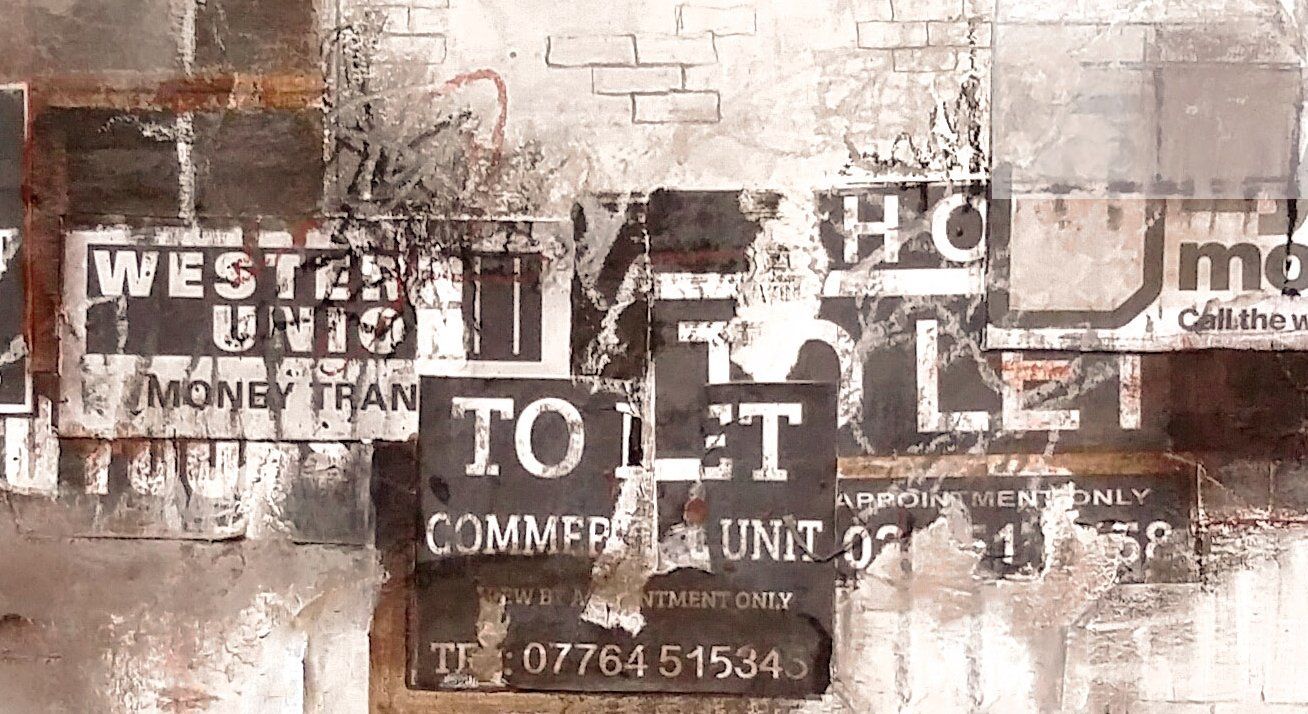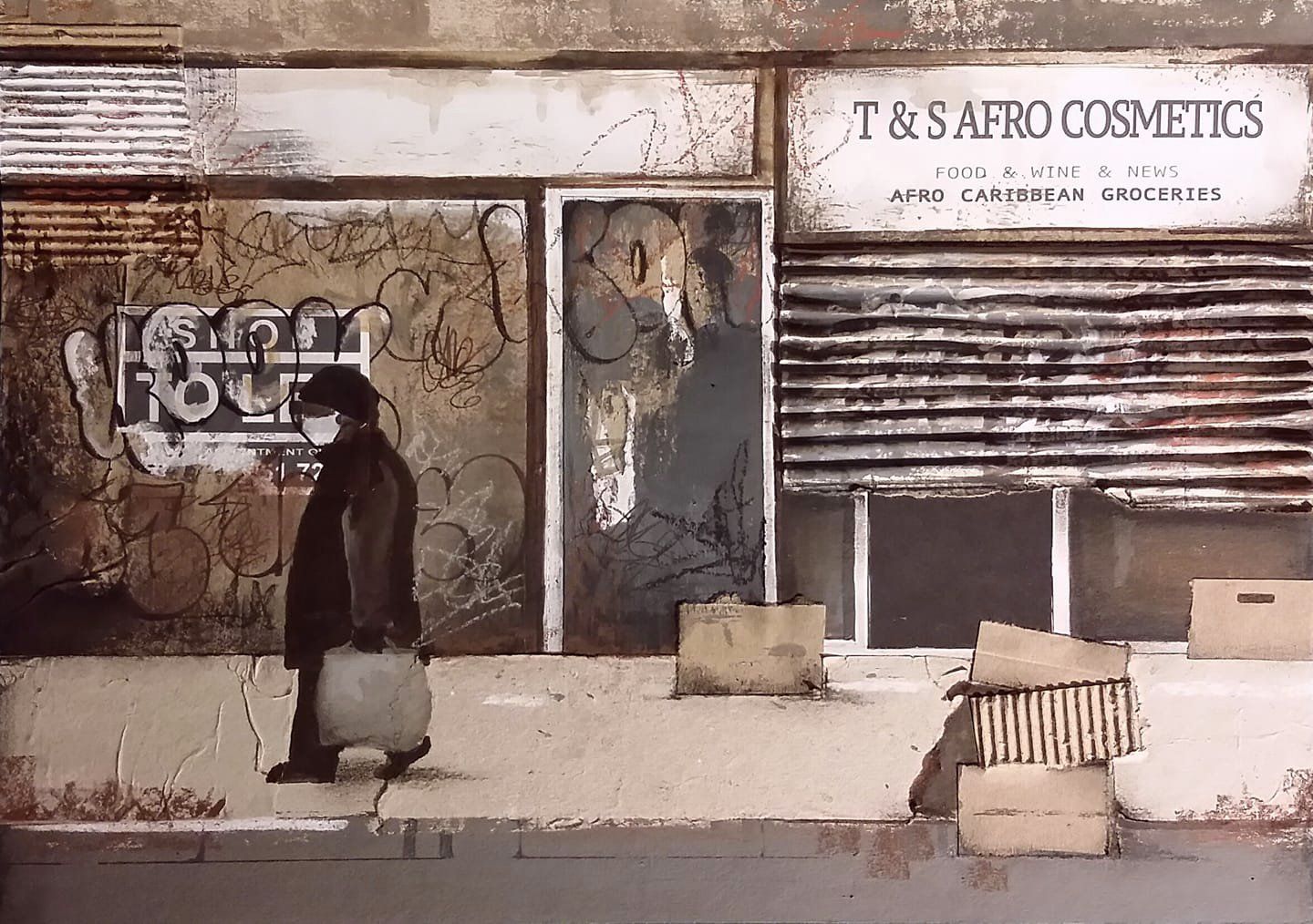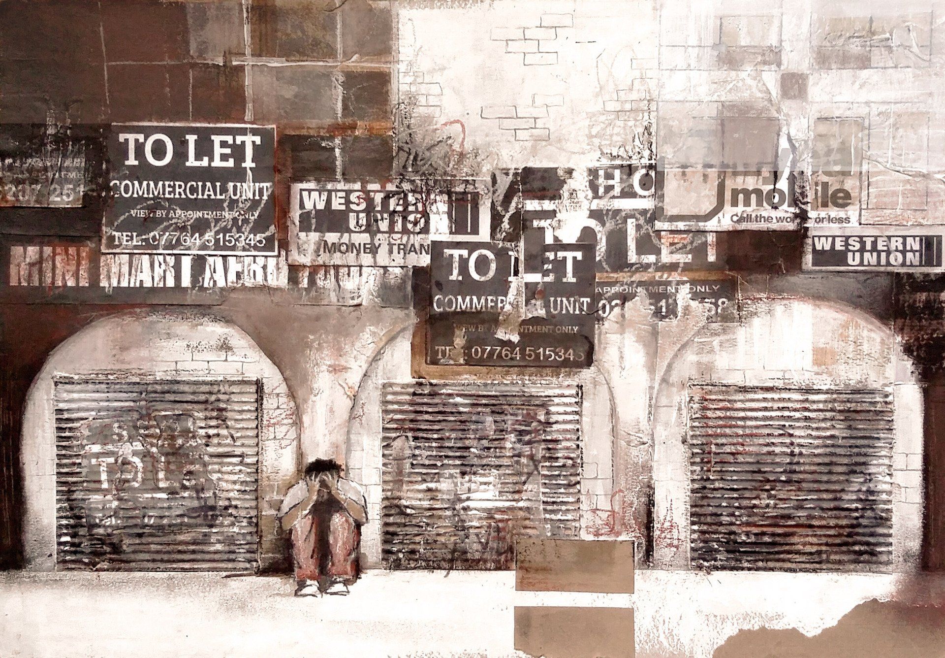 Old packaging and printed signage form the images' collage background, over which acrylic paint, oil pastel and ink add distressed layers. Shuttered shops, grafittied alleys, a jumble of 'To Let' signs and urban decay create the backdrop to lone figures shuffling along deserted streets, still surviving, still clinging on.