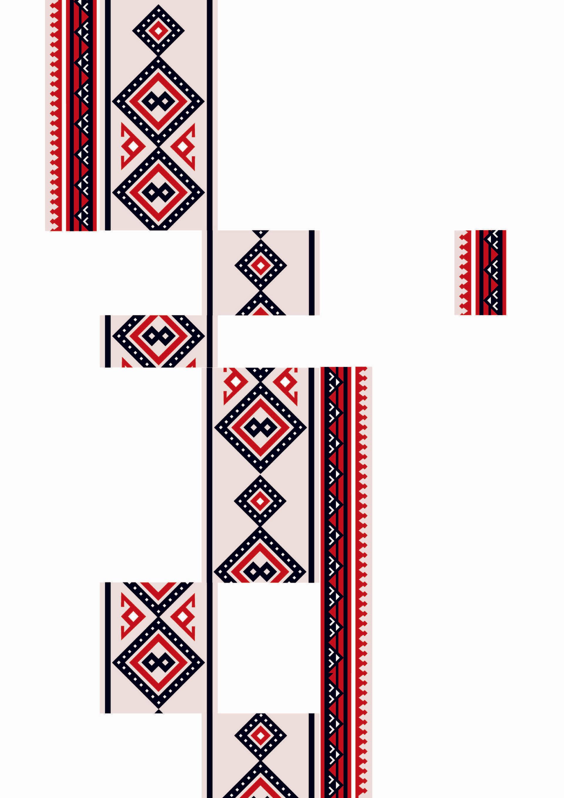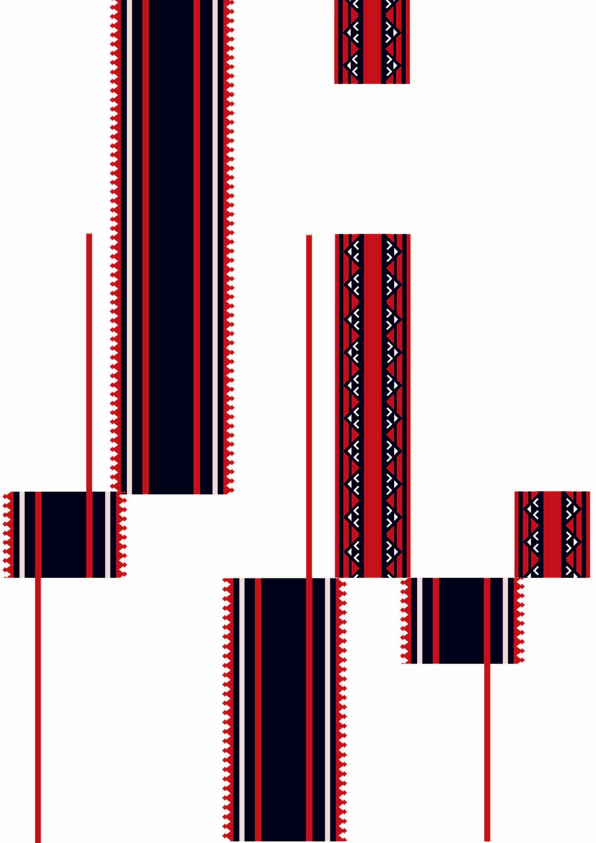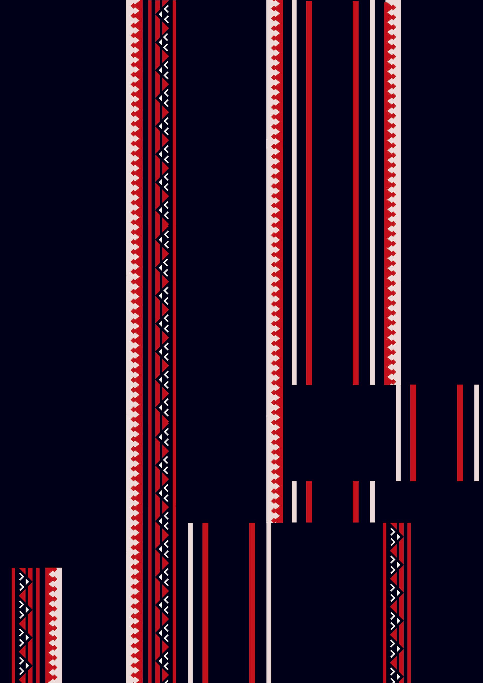 These four abstract pieces use digital techniques to recreate elements from traditional Bedouin woven patterns. However, the original, regular rhythms of the designs are interrupted and fragmented, to represent the reorganisation of many aspects of Bedouin traditions. Despite this, the designs aim to retain and fuse modern, abstract artistic styles of composition with traditional symbols, suggesting the new forms of ‘modernity’ being experienced and developed in Bedouin communities.